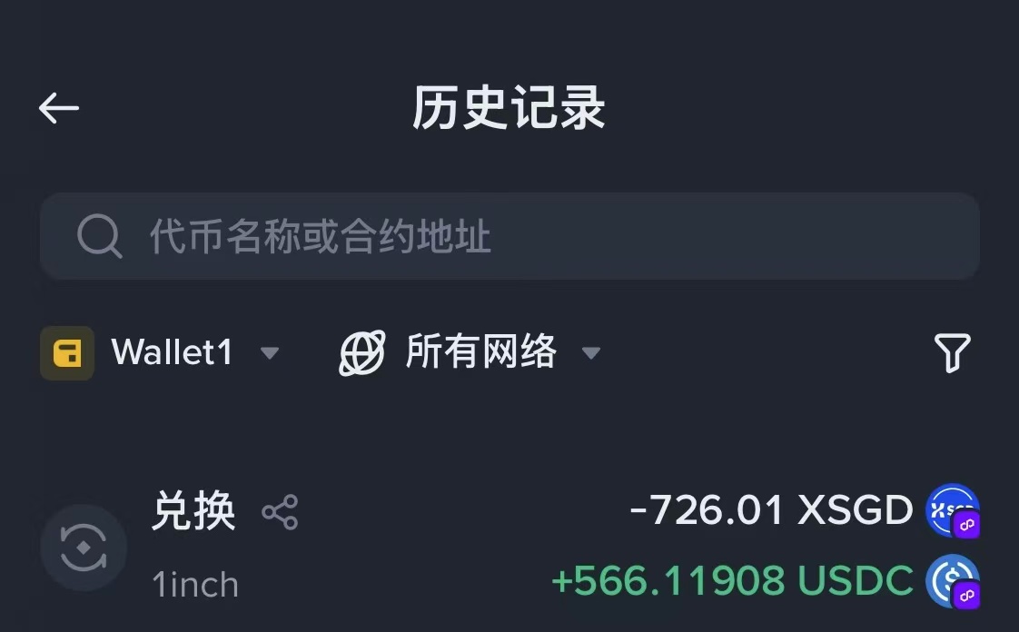 币安钱包兑换:1000XSGD(polygon)=783.27USDC(polygon),费后783.16USDC