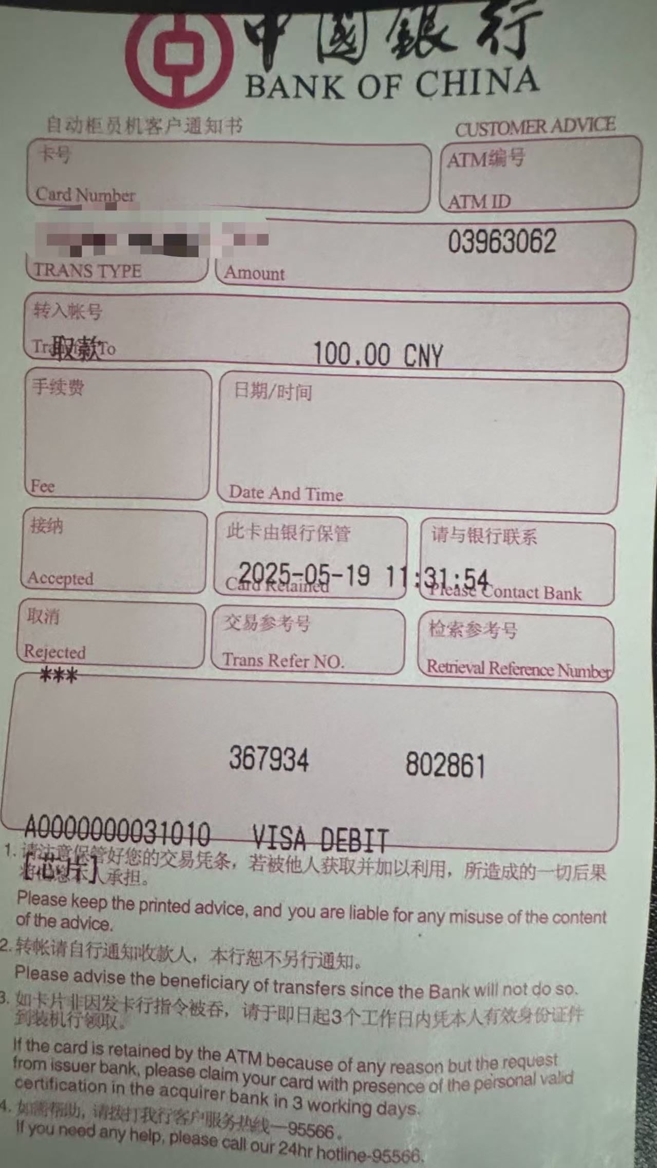 地点选中国,备注里我用英语写着:刚收到卡,激活了,我要去atm取款试一下。